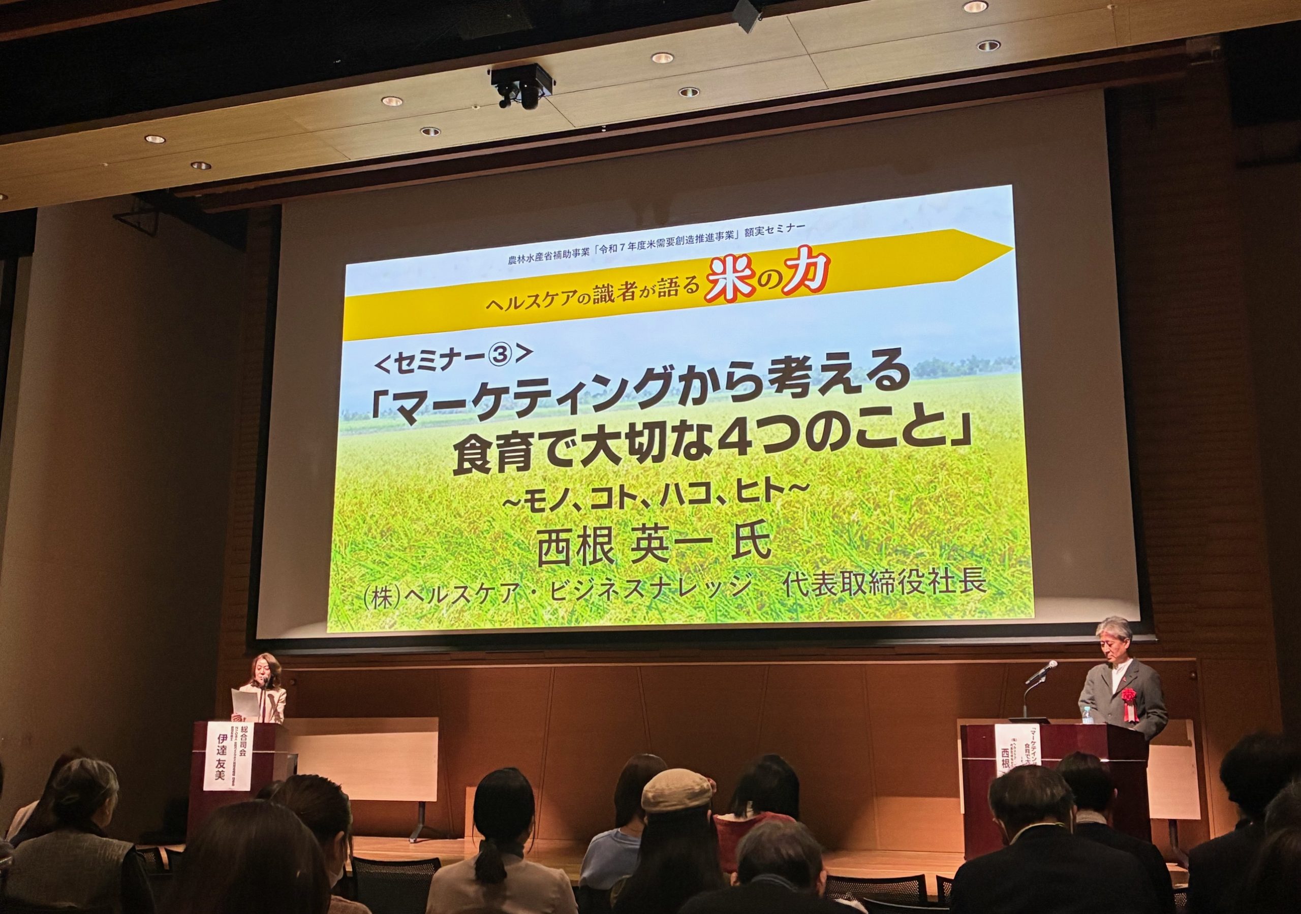 最後は、ヘルスケア・ビジネスナレッジの西根英一氏が、「マーケティングから考える 食育で大切な4つのこと」と題して講演した。マーケティングを「目的とする行動を獲得すること」とし、米の需要拡大においては「ご飯をどう食べるか、どう食べ続けてもらうか」が正に目的行動にあたると指摘。その行動変容の設計にあたり、①モノ(ブランディング)②コト(イシューイング)③ヒト(ターゲティング)④ハコ(マーケティング)のマーケティングアプローチの4つの戦略の関係を説明。特に土台となる②課題化や話題下で普及啓発に繋がる空気を広めるイシューイングと④市場が広がるマーケティングの戦略の重要性を説いた。また最後には、ヘルスケアが、健康から健幸へ、カラダ・ココロ・キズナのバランスを整えるウェルビーングへの潮流に言及した。